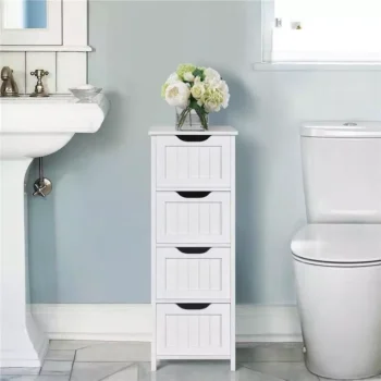 Elegant White Wooden Bathroom Cabinet with 4 Drawers – Stylish Storage Organizer for Small Bathrooms
