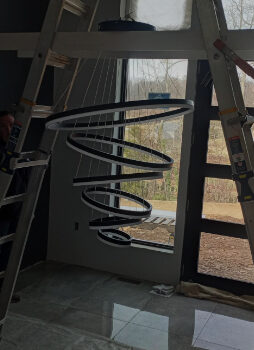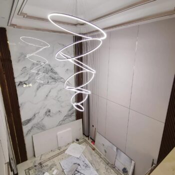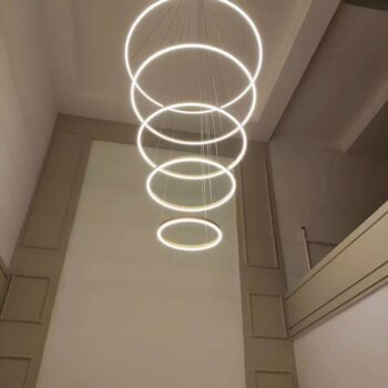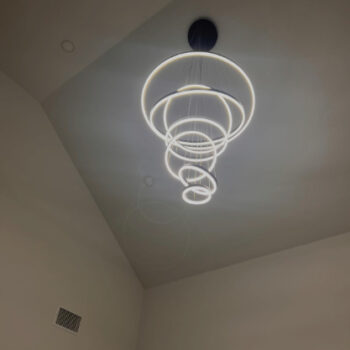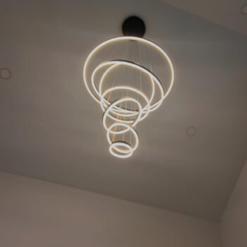 This light fixture demands attention with its distinctive design. Installation requires two people due to its size and weight, and organizing the cables and wires to achieve the desired arrangement of the rings can take some time. I found suspending it from a ladder useful for this process, along with tidying the wires inside the canopy cover and trimming any excess non-electrical cables.