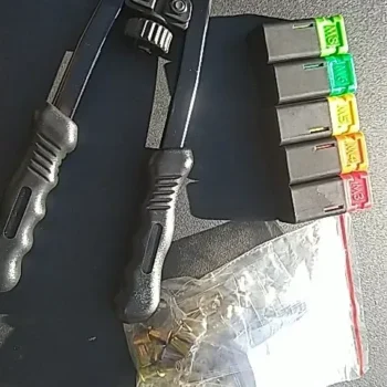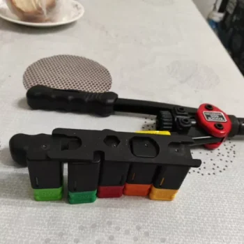 One nozzle was already installed, so don't worry if one container is empty. The tool looks good and seems like it will last with careful use. I tried riveting a steel M8 rivet, and the effort required was moderate.