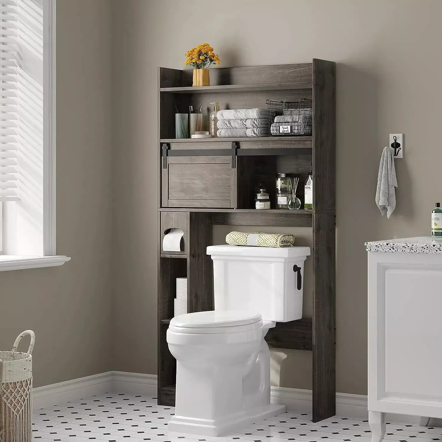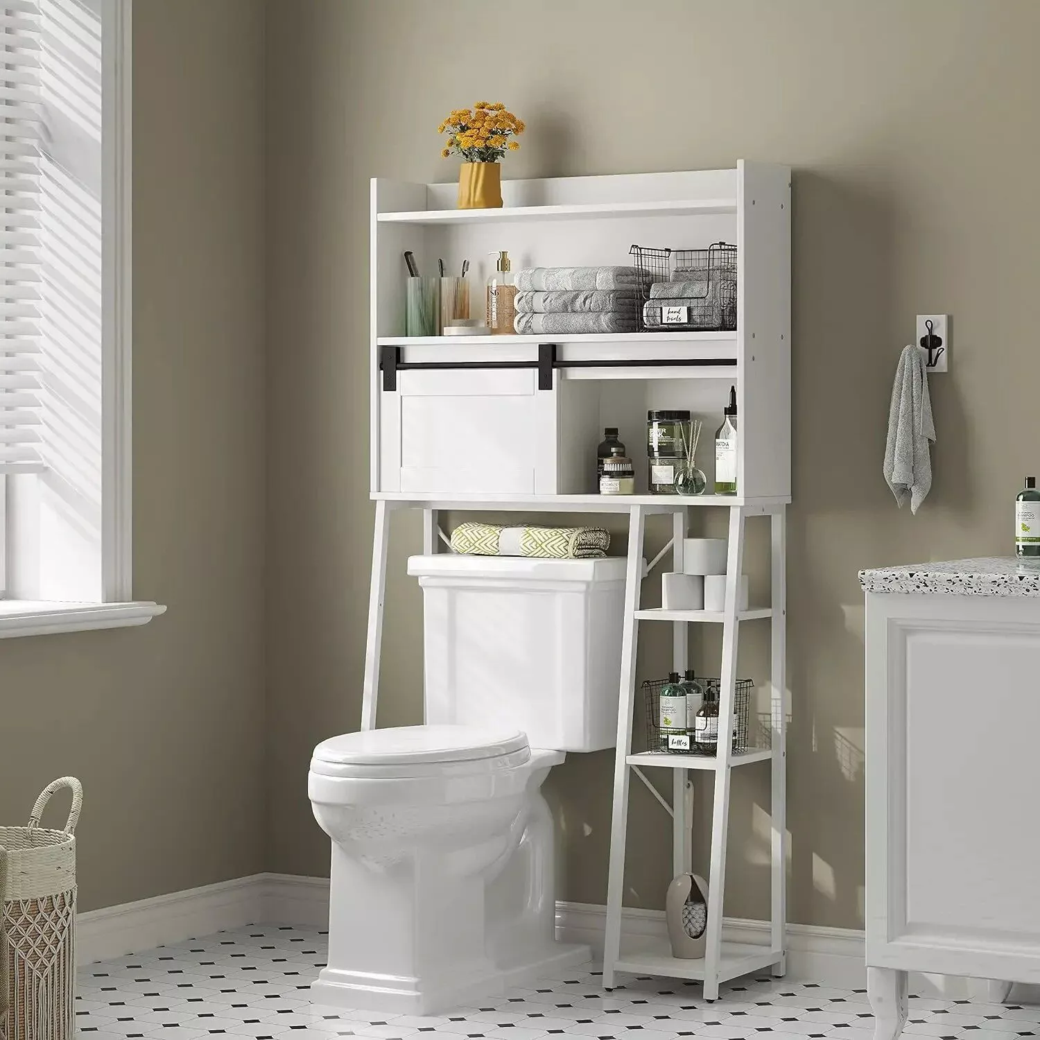 Bring balance, beauty, and order to your bathroom with the Elegant White 6-Tier Over-The-Toilet Storage Cabinet — where style and practicality find perfect harmony. This sleek organizer turns unused vertical space into a statement of smart design. With its modern barn door charm and crisp white finish, it’s more than furniture — it’s a fresh breath of sophistication for your space.