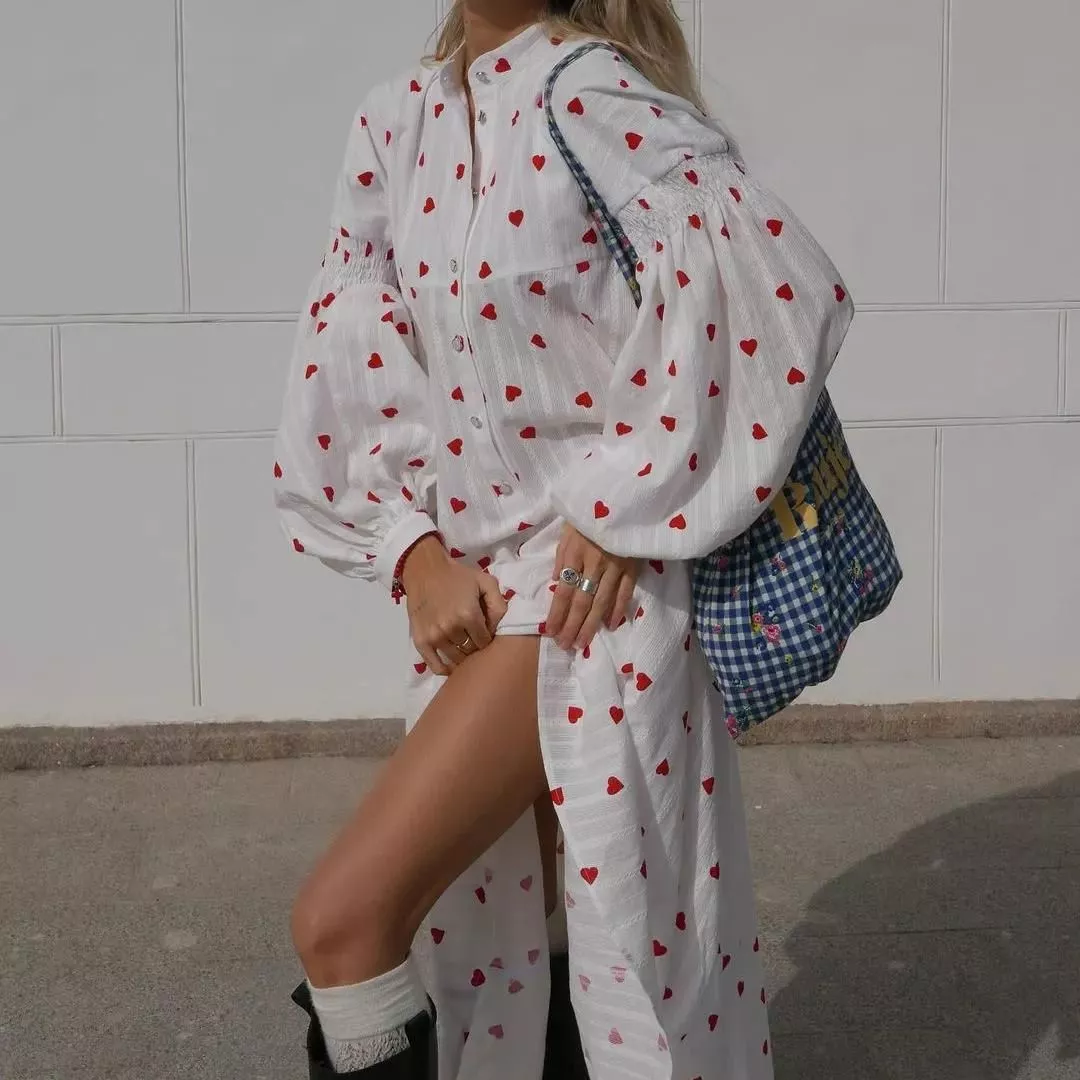 Step into a world where comfort meets style with our Heart Print Cotton A-line Long Sleeve Summer Dress. Designed for the modern woman who cherishes both style and comfort, this dress is a testament to timeless fashion. Its loose fit silhouette ensures a flattering look for all body types, making it a versatile addition to any wardrobe.