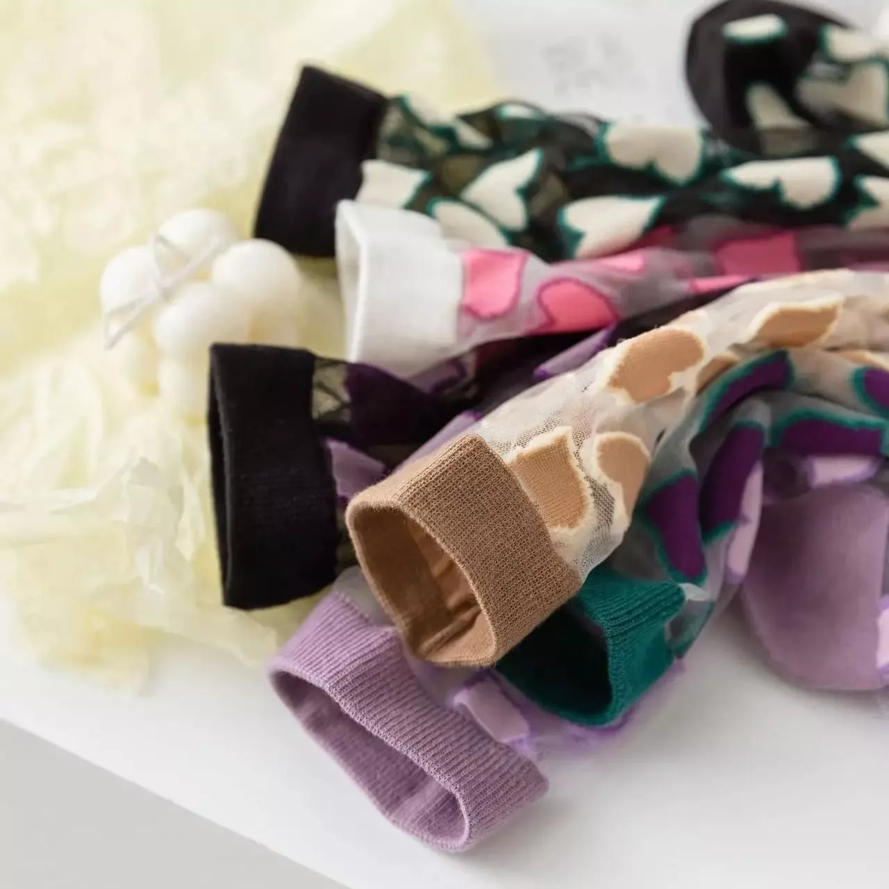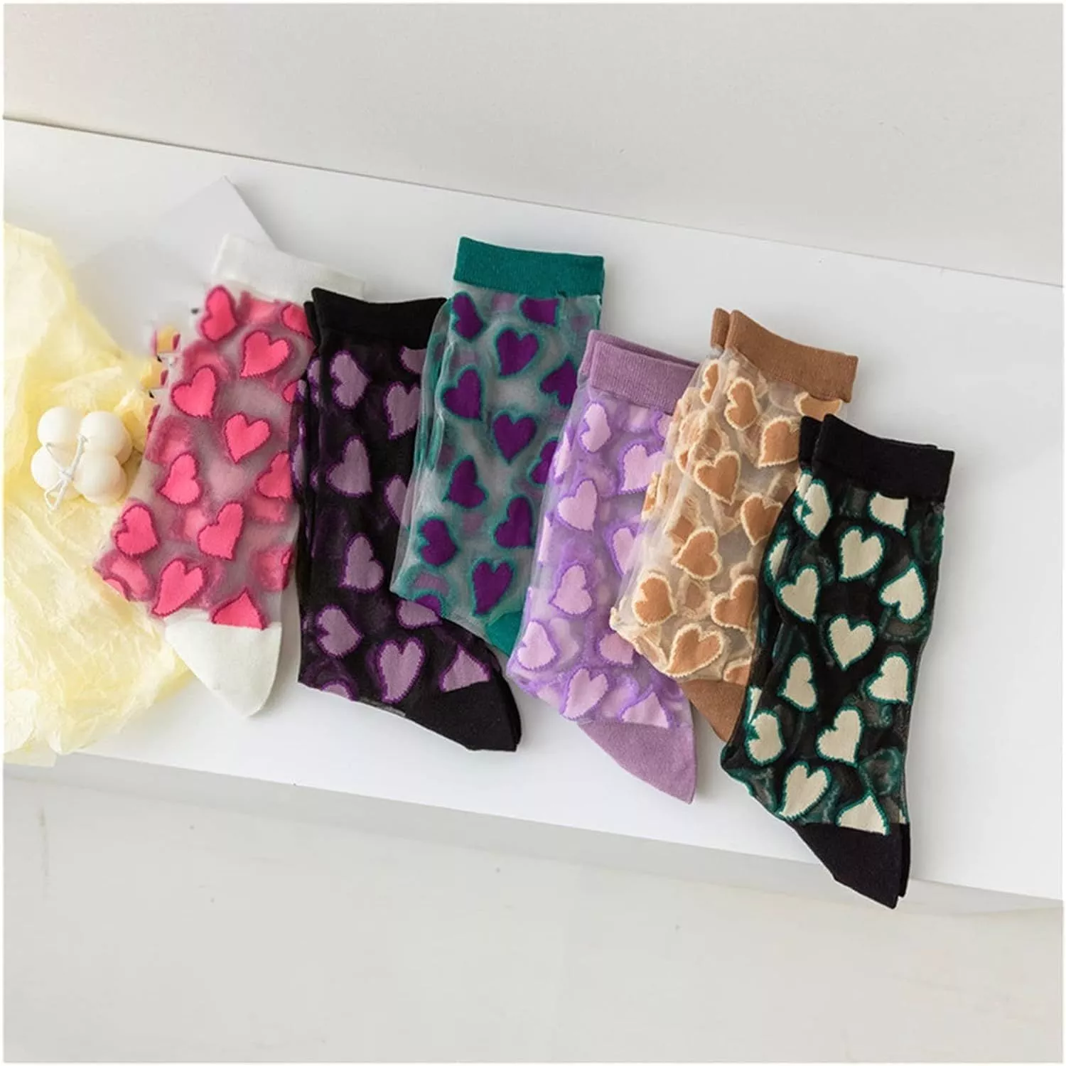 Featuring a delicate heart print design, these socks are perfect for adding a subtle yet charming accent to your outfit. The ultra-thin and transparent fabric make them ideal for warm summer days, providing breathability and comfort without compromising on style.