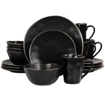 Elegant 16-Piece Matte Black Stoneware Dinnerware Set with Gold Trim