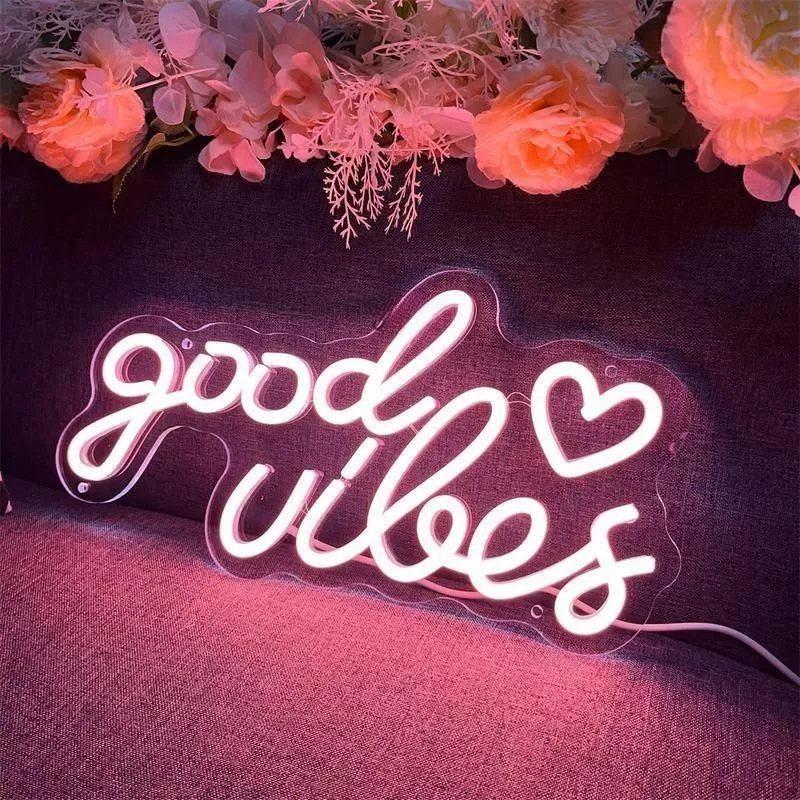 Embrace the beauty and vibrancy of our LED Neon “Good Vibes” Sign, and let it transform your space into a welcoming haven of good vibes and positivity. Whether it’s setting the mood for a party, adding a unique touch to your decor, or simply lighting up your everyday, this neon sign promises to be a captivating centerpiece. Order yours today and illuminate your world with style!