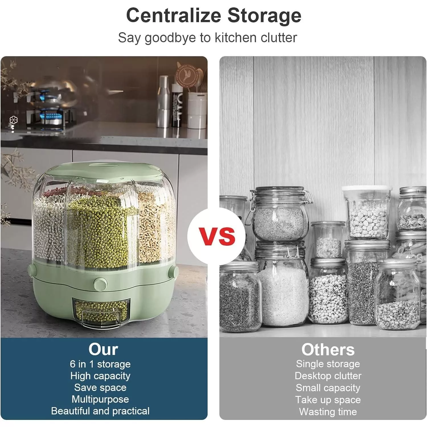 Introducing the ultimate solution for modern kitchen organization – our 6-Grid Rotating Grain Dispenser. This innovative container is designed to enhance your kitchen’s functionality while adding a touch of elegance. Say goodbye to cluttered shelves and hello to sleek, efficient storage with our cereal and grain dispenser.