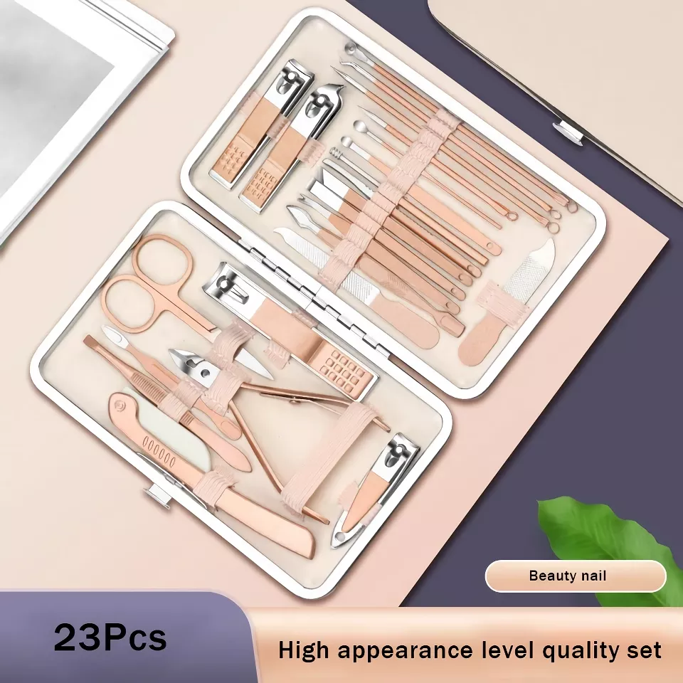 The Rose Gold Stainless Steel Nail Art & Grooming Kit comes in various sets ranging from 7 to 23 pieces, each designed to provide a complete grooming experience. The tools are made from high-quality stainless steel with a stunning rose gold finish, ensuring durability and a touch of luxury.