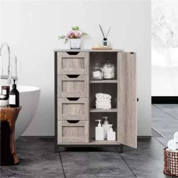 Elegant Gray Wooden Bathroom Storage Cabinet with 4 Drawers and Adjustable Shelves