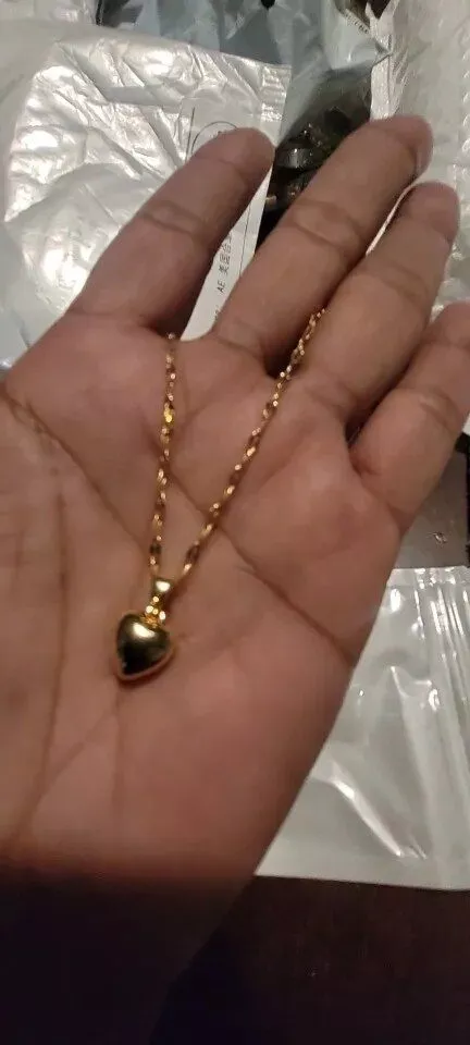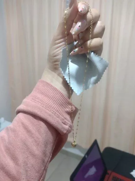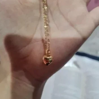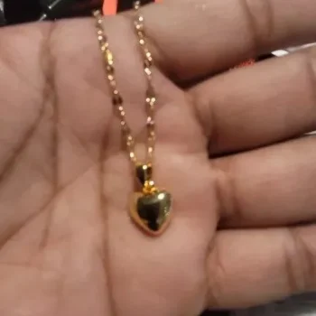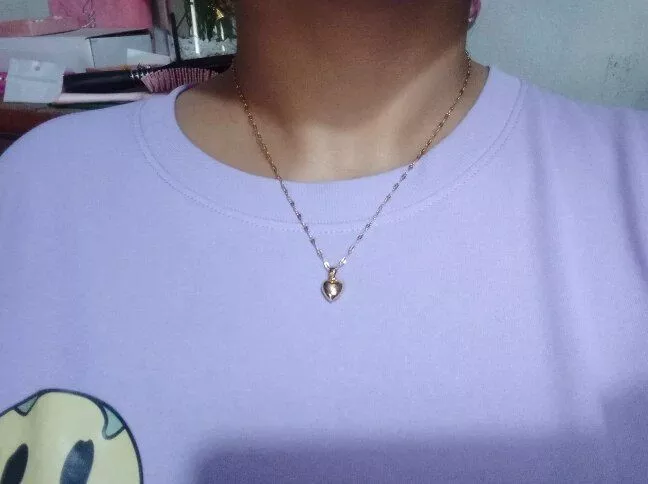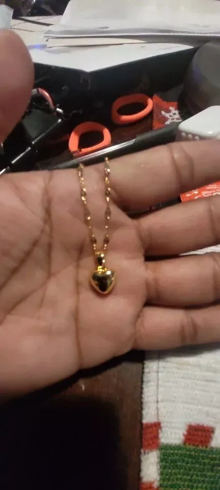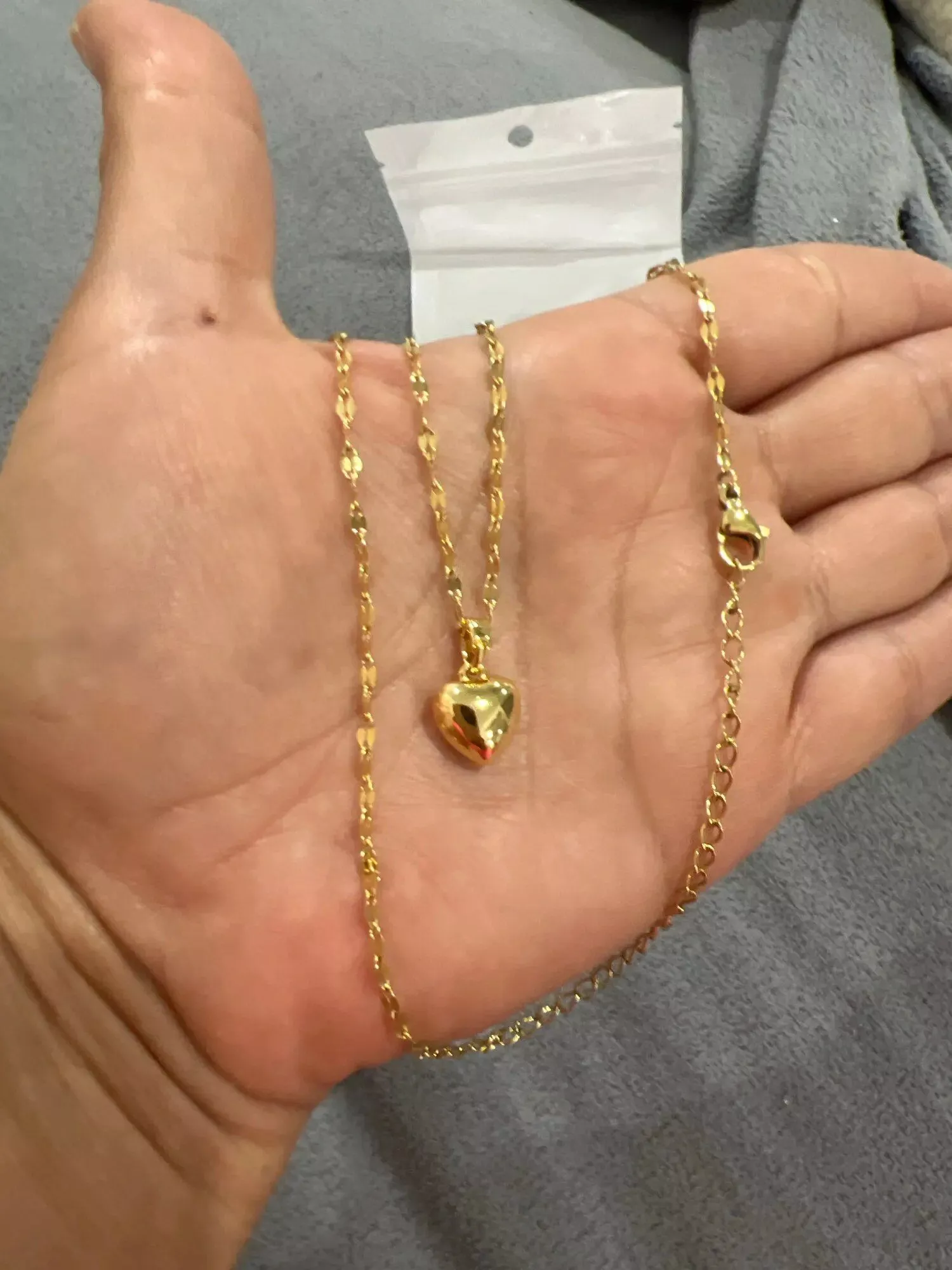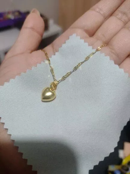 The heart is small, in general very bright and beautiful, I liked it very much, it has a small defective heart and does not look totally smooth on the one hand, but it is almost not noticeable, the chain is not so long, I do not recommend if you have a very wide neck it could be uncomfortable, Bring a cloth to clean.