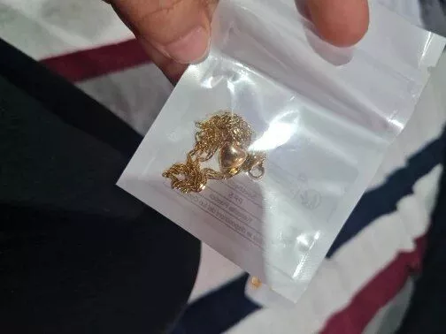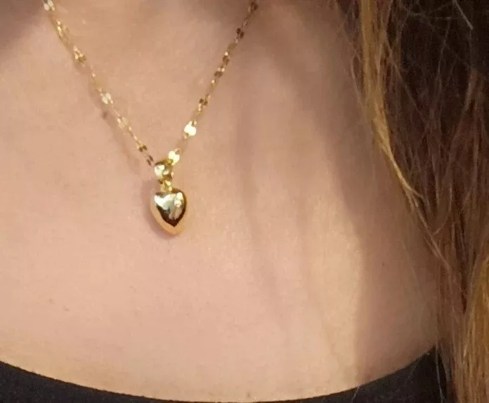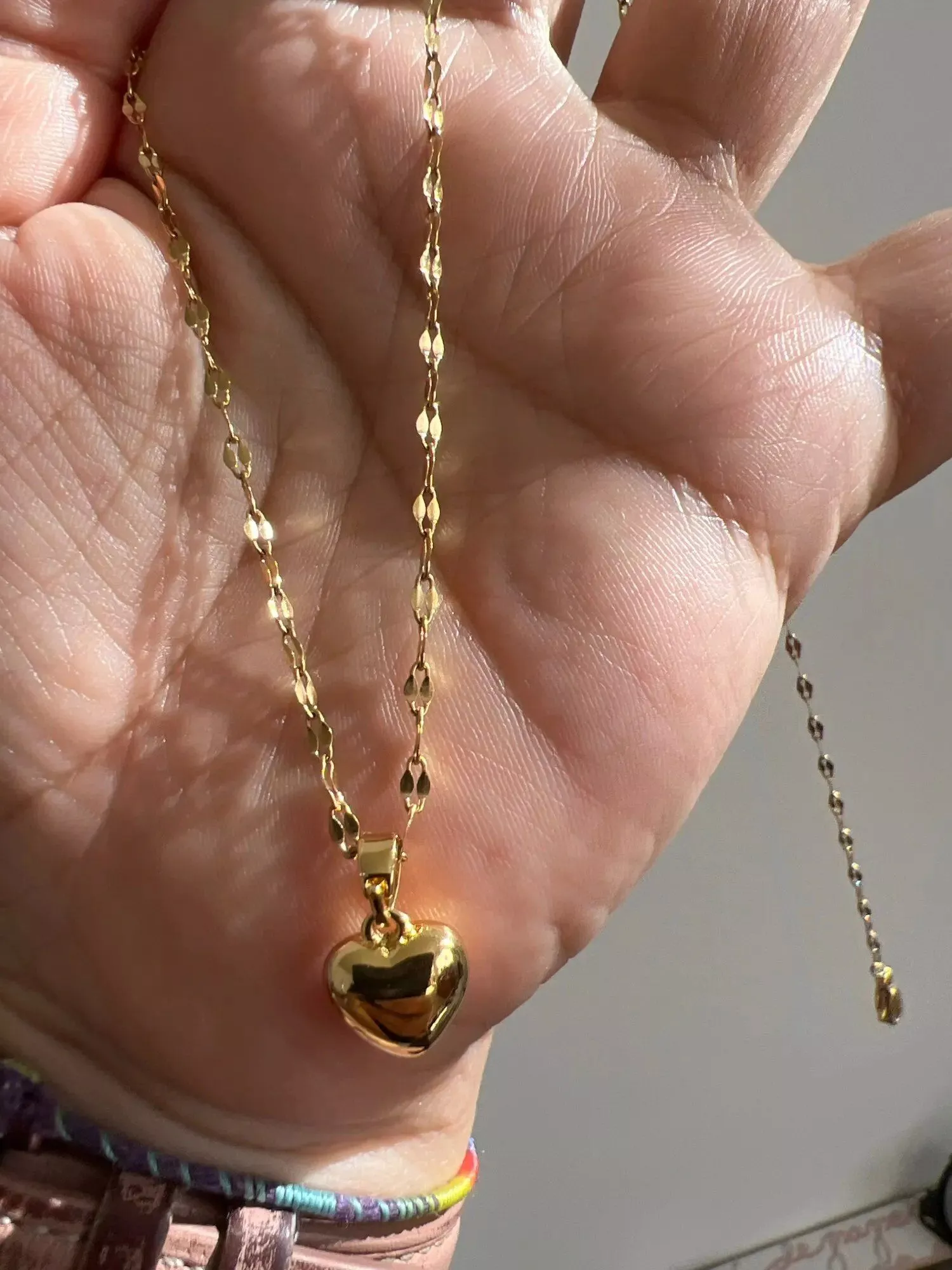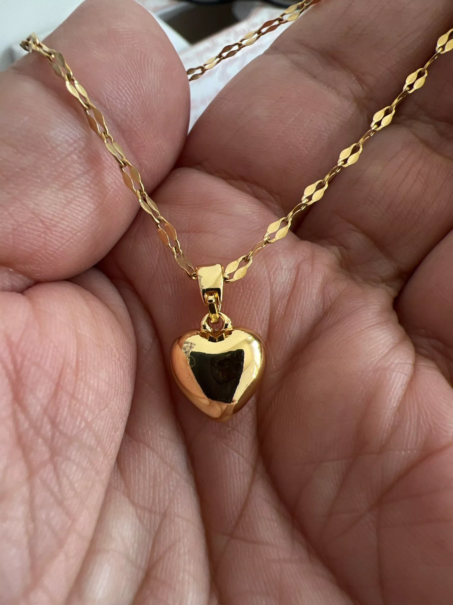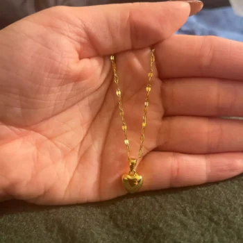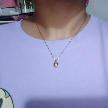 The heart is small, in general very bright and beautiful, I liked it very much, it has a small defective heart and does not look totally smooth on the one hand, but it is almost not noticeable, the chain is not so long, I do not recommend if you have a very wide neck it could be uncomfortable, Bring a cloth to clean.