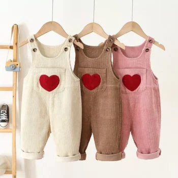 Kids Spring Corduroy Suspender Overalls with Heart Embroidery