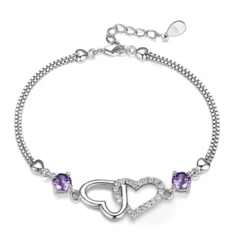 Sterling Silver 925 Heart Charm Bracelet with Natural Amethyst Zircon