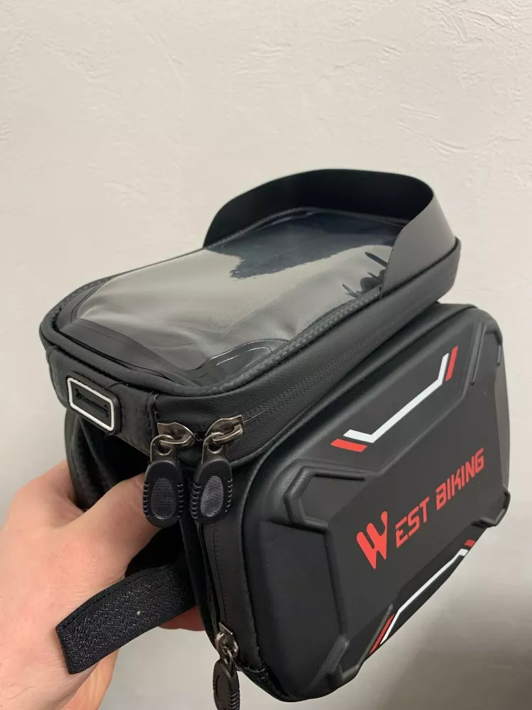 Just got this and used it last night! Instead of carrying phone, keys, wallet, etc in a knapsack, I can now put it all in this convenient little pouch! I have a large smartphone that fits perfectly in the phone section. Large, secure velcro flaps close around the back of the phone holding it against the pouch touch screen. Touch screen is thin enough to respond to touch and face recognition (iPhone unlock feature). I carried my wallet and full set of keys inside the pouch. Enough room for a few more things, like a multi-tool or smaller patch kit. Velcro fasteners keep the pouch secure to the bike itself. One strap goes around the stem for your handlebars and two straps at each end of the bottom (one goes to the left and one goes to the right to stabilize pouch) that are easily synched tight. During my ride, nothing moved and was able to FFwd my music easily as I rode. I would caution to avoid playing with phone while riding. ;) It is just like driving. Eyes on the trail, path, road! #donottextandride The item is brand new so zippers were a little tough to get started, but surely will relax a bit as they get used (typical for zippers). Well made unit. This unit is water resistant, not waterproof. So, no bike diving!